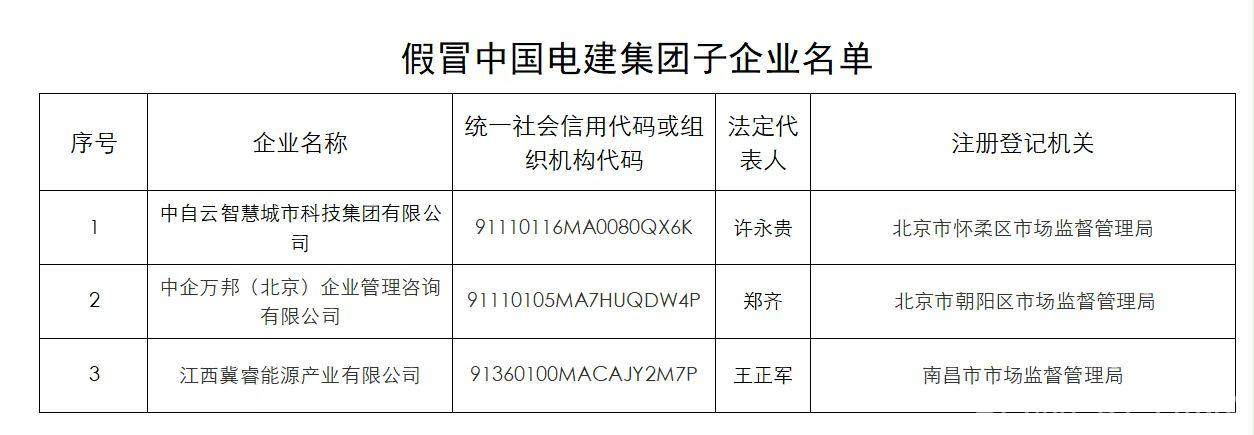 長期以來,有不法分子通過偽造相關材料等方式,將企業注冊為中國電建集團下屬子公司,以中國電建集團下屬子公司名義開展業務。經我集團核實,以下公司及其下設各級子公司均為假冒國企,與中國電建集團無任何隸屬或股權關系,也不存在任何投資、合作、業務等關系,其一切行為均與中國電建集團無關。請社會各界提高警惕,注意防范風險,如發現其違法犯罪行為,請盡快到公安機關報案。